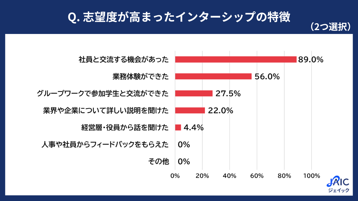 「志望度が高まった」と回答した学生に、「志望度が高まったインターンシップの特徴として、あてはまるものをふたつ選択してください」と質問したところ、「社員と交流する機会があった」が89.0%、「業務体験ができた」が56.0%、「グループワークで参加学生と交流ができた」が27.5%、「業界や企業について詳しい説明を聞けた」が22.0%、「経営層・役員から話を聞けた」が4.4%、「人事や社員からフィードバックをもらえた」「その他」がそれぞれ0%という結果となった。