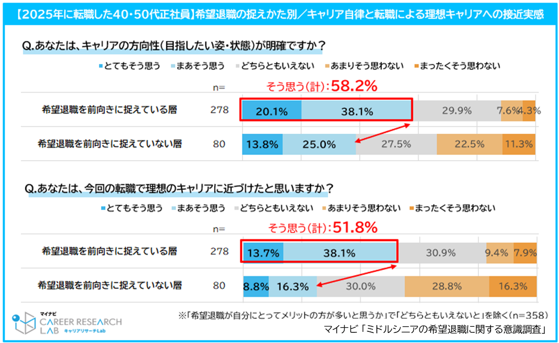 また、「転職に対する考え方」について、「今回の転職で理想のキャリアに近づけたと感じている」割合は、「希望退職を前向きに捉えている層」(51.8%)は「前向きに捉えていない層」(25.1%)より26.7ポイント高かった。