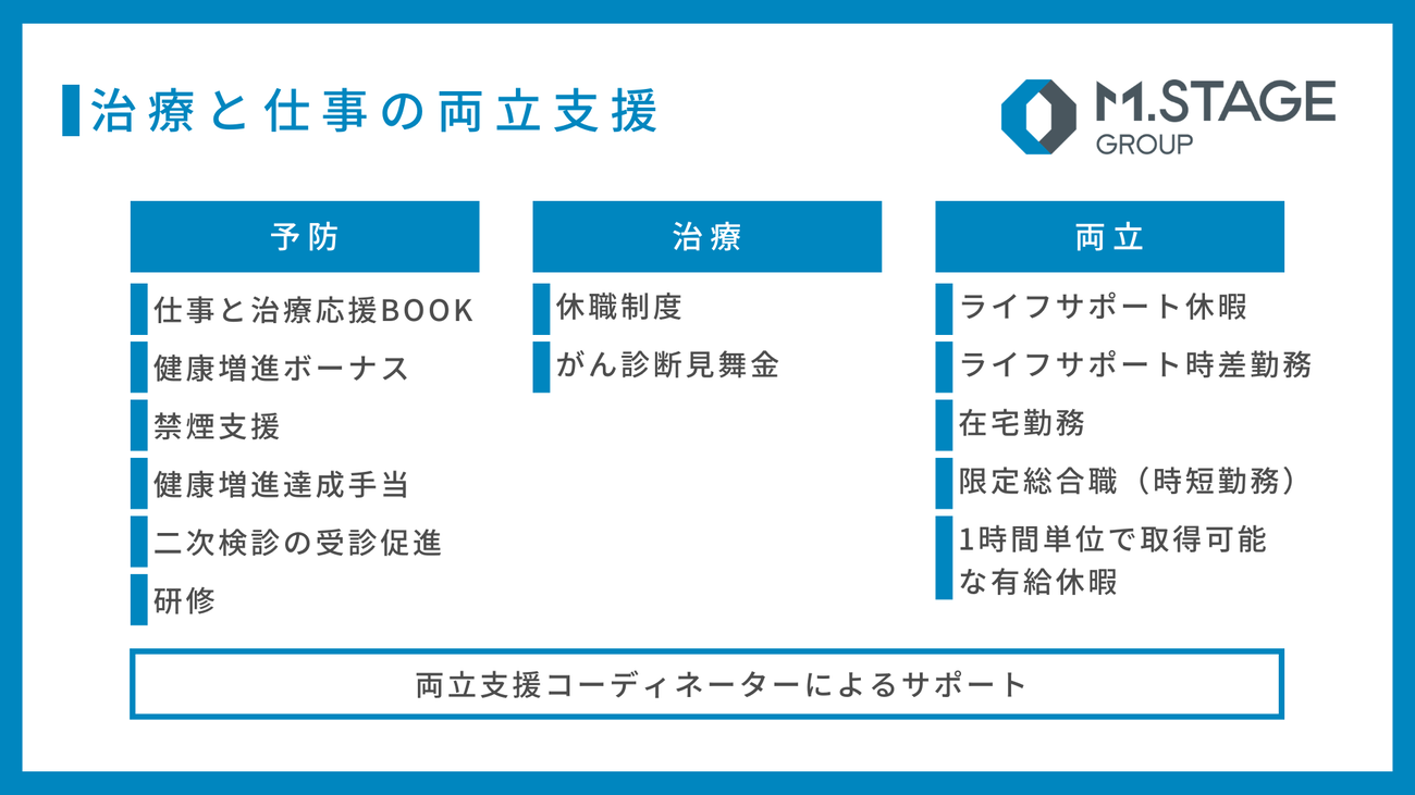 エムステージグループは、従業員に対し適切な治療を受けながら安心して働き続けられる環境を整備するため、多層的な制度を再編・拡充した包括的な「治療と仕事の両立支援制度」を4月1日より開始する。