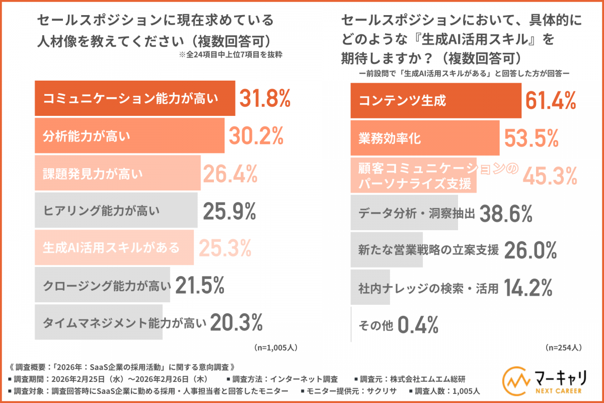 「セールスポジションに現在求めている人材像」を尋ねたところ、「コミュニケーション能力が高い」(31.8%)が最も多く、「分析能力が高い」(30.2%)、「課題発見力が高い」(26.4%)、「生成AI活用スキルがある」(25.3%)と続いた。