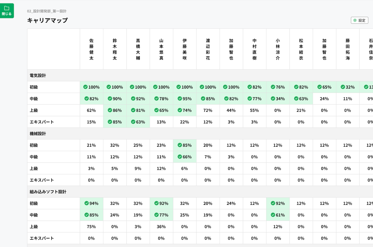 電気設計や機械設計などの職種や職務ごとに「初級→中級→上級→エキスパート」といったステップアップと、各ステップアップに求められるスキルや資格、経験などの要件を設定できる。各従業員がそれらの要件をどの程度充足しているかを、組織全体で一覧化して把握できるため、複数資料の照合や個別確認といった煩雑な作業を省ける。