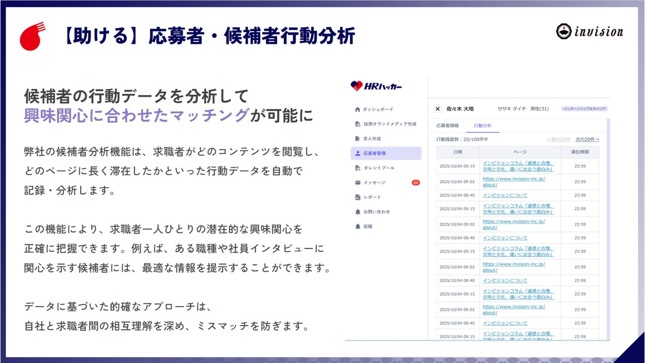 どの候補者がどのコンテンツページを閲覧したか、という閲覧履歴や滞在時間などのデータをもとにした候補者の特徴を分析する。これにより、候補者1人ひとりの興味関心に合わせた情報提供や、データに基づいた的確なアプローチで相互理解を深め、ミスマッチのリスクを最小限に抑える。
