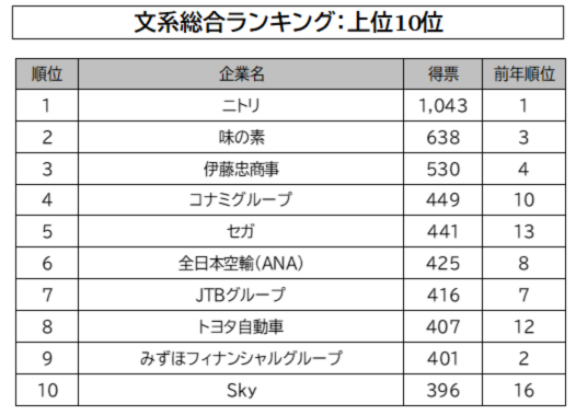 「ニトリ」が4年連続トップ。前年3位の「味の素」が2位にランクアップした。「コナミグループ」が前年10位から4位と前年に引き続きさらに順位を上げたほか、「セガ」「トヨタ自動車」「Sky」が新たにトップ10入りを果たした。