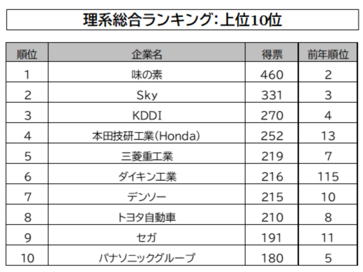 前年2位の「味の素」が首位に。6位「ダイキン工業」が前年115位から大きく順位を上げた。「本田技研工業(Honda)」が前年13位から4位、「デンソー」が前年10位から7位、「トヨタ自動車」が8位をキープするなど、自動車関連が存在感を示している。
