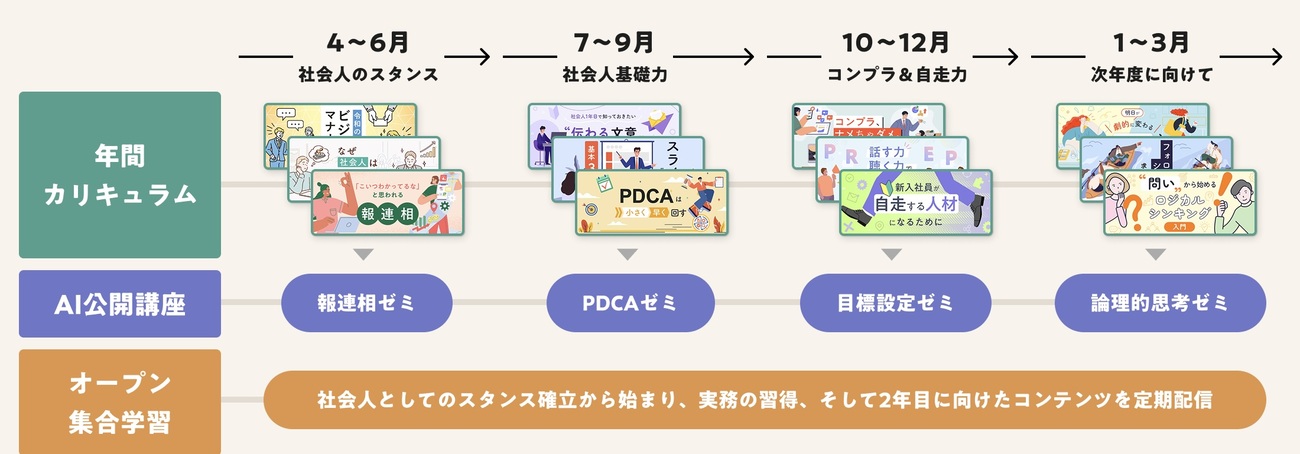 単なるおすすめ授業の羅列ではなく、140万人の学習ログをもとに、実際の受講傾向や活用実績を踏まえて授業を選定し、3ヵ月単位の通年計画としてパッケージ化。人事担当者は、自社の対象階層に合ったモデルを選ぶだけで運用を開始できる。人材開発に十分な時間を割きにくい中でも、月3時間程度の運用で年単位の育成計画を進めやすい設計となっている。