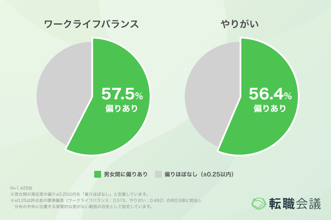 「ワークライフバランス」「やりがい」の男女別満足度を分析したところ、6割近くの企業で男女いずれかの評価に±0.25を超える偏りが見られた[1]