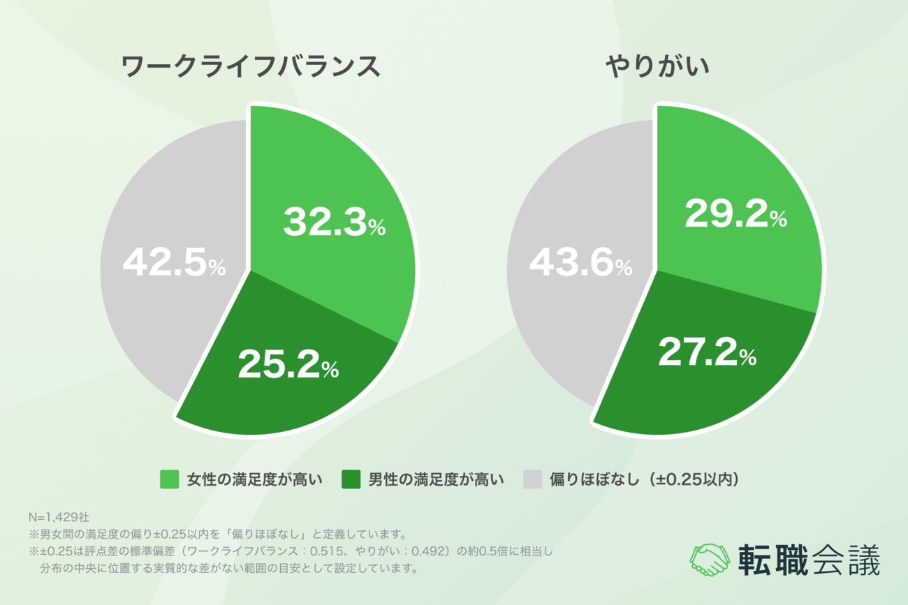 それぞれを男女で分けてみると「ワークライフバランス」は、女性の満足度が高い企業(32.3%)が男性の満足度が高い企業(25.2%)を上回った。「やりがい」は、女性の満足度が高い企業(29.2%)が男性の満足度が高い企業(27.2%)を上回り、総じてどちらの観点においても女性の満足度が上回る結果が得られた。