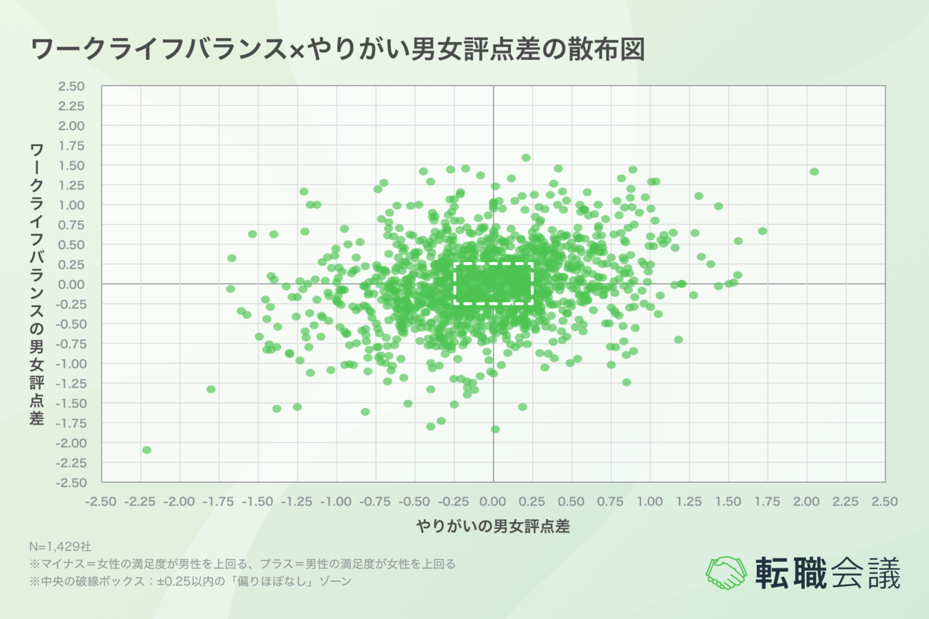 さらに、ワークライフバランスとやりがいの男女評点差を2軸にとった散布図(n=1429社)から、次図の構造が浮かび上がった。