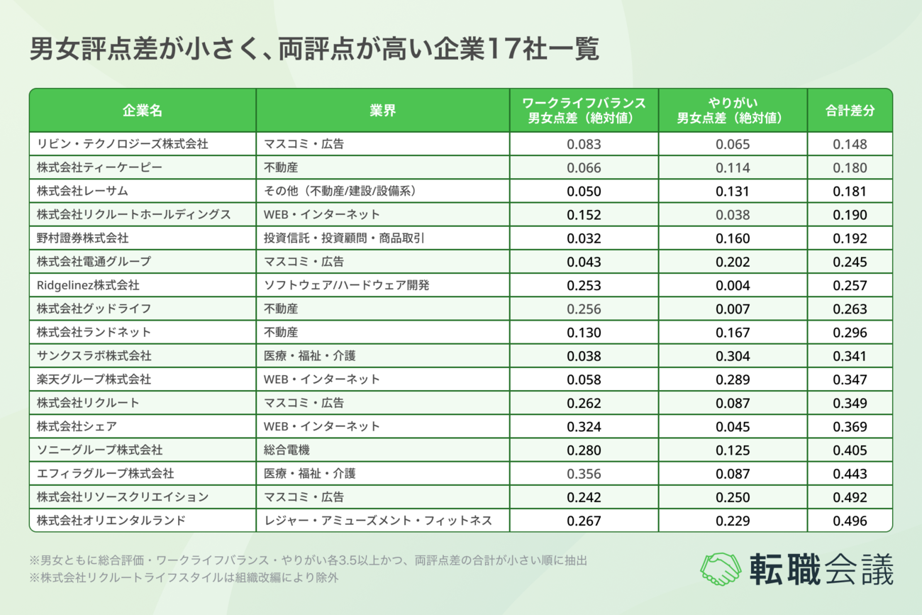 男女評点差が小さく、両評点が高い企業17社一覧(サンプル)